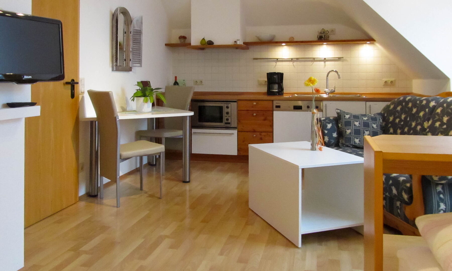 Dieses Mini-Apartment verfügt über einen Wohn-Schlafbereich mit Bad und Dusche. 2 getrennte Boxspring-Einzelbetten unter einer Schräge.
