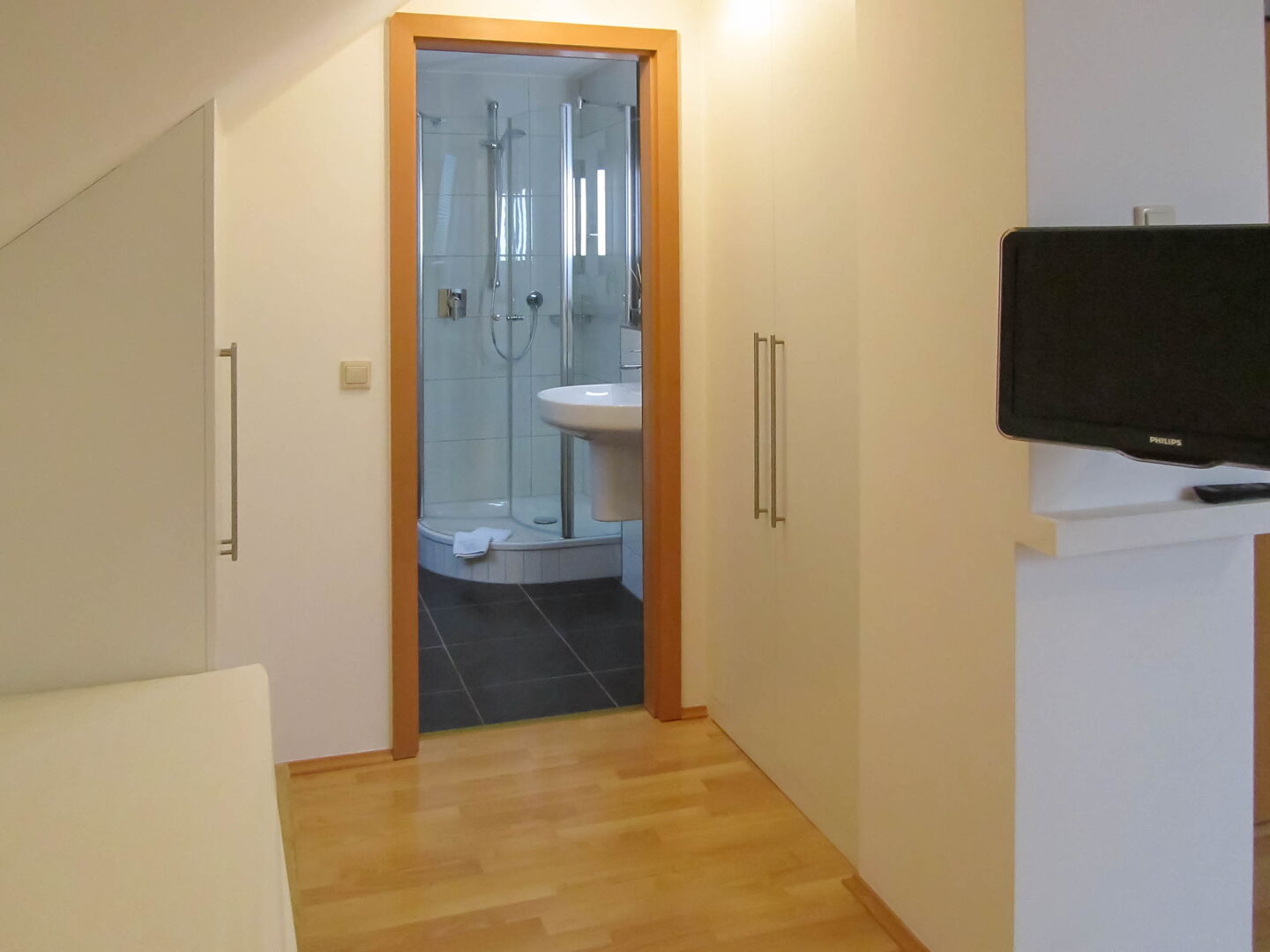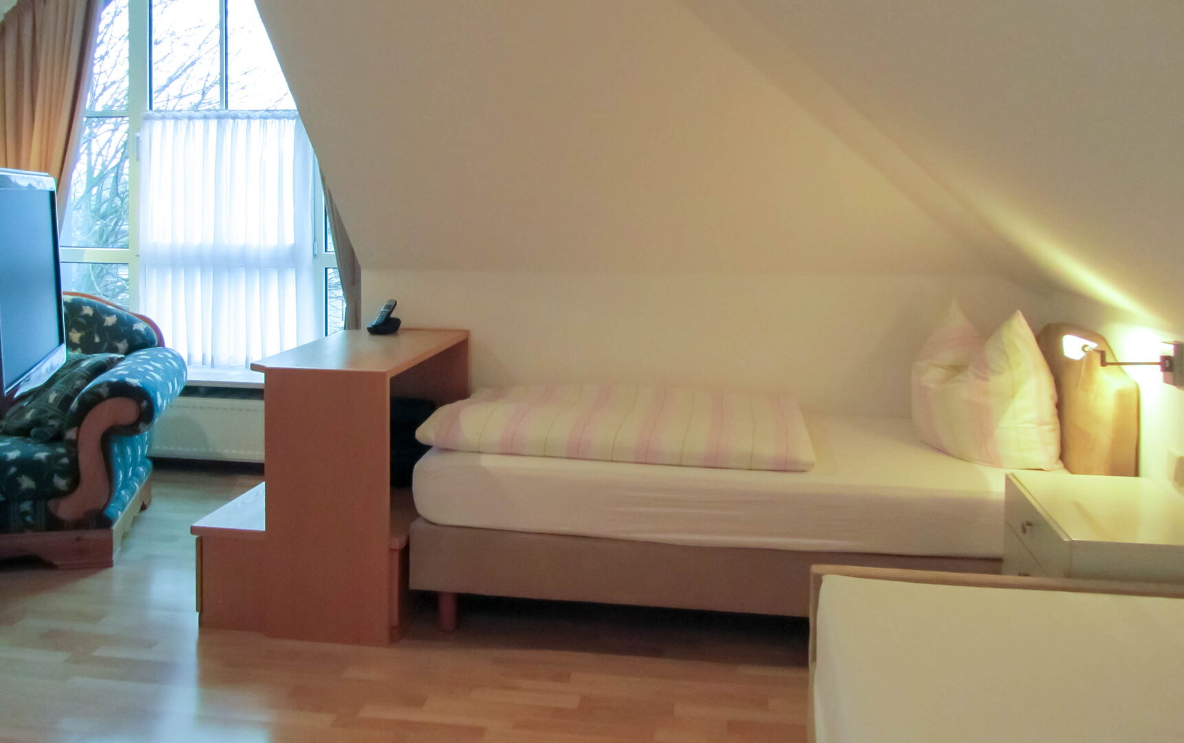 Dieses Mini-Apartment verfügt über einen Wohn-Schlafbereich mit Bad und Dusche. 2 getrennte Boxspring-Einzelbetten unter einer Schräge.